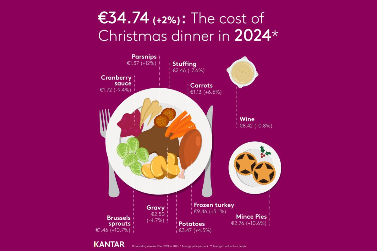For a family of four, the cost of an average Christmas dinner has risen to €34.74, which is up 2 per cent on last year, driven mainly by the price of turkey and Christmas vegetable staples, with Brussels sprouts and mince pies seeing an increase of over 10 per cent in price versus this time last year. Wider grocery inflation increased to 3.6 per cent versus 3.3 per cent last month.