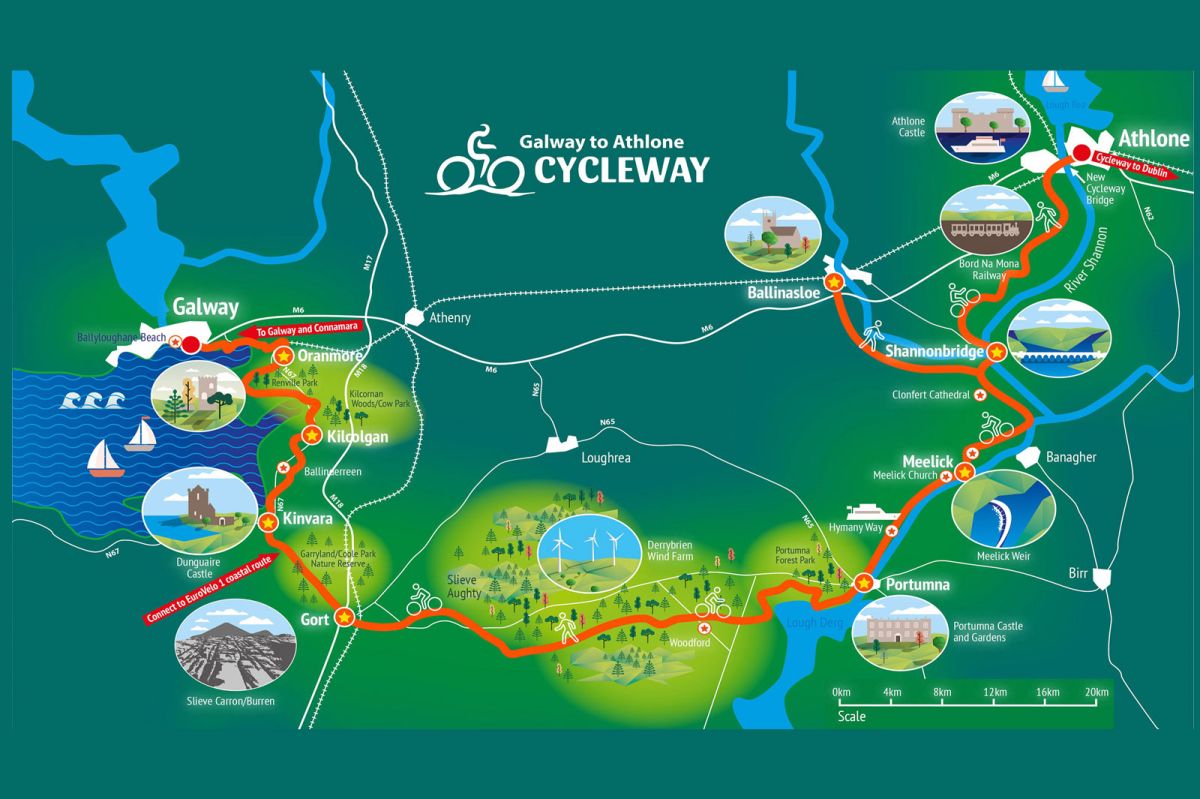 The off-road Galway-Athlone project will create an accessible cycling and walking route from Ballyloughane Beach at Galway city to Athlone Castle, Co. Westmeath. It will pass through lands adjacent to Oranmore, Rinville, Clarinbridge, Kilcolgan, Kinvara, Gort, Woodford, Portumna, Meelick, Clonfert, Ballinasloe and Shannonbridge.