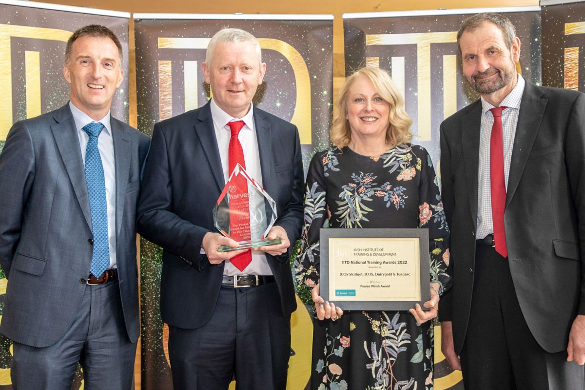 Caption: L-R Dr. Tom O'Dwyer (Teagasc), Billy Cronin (Dairygold), Breeda Flood (ICOS Skillnet) and Jerry Long (ICOS President) at the IITD National Training Awards 2022, Killashee, Naas, Kildare. Photo: Michael Donnelly