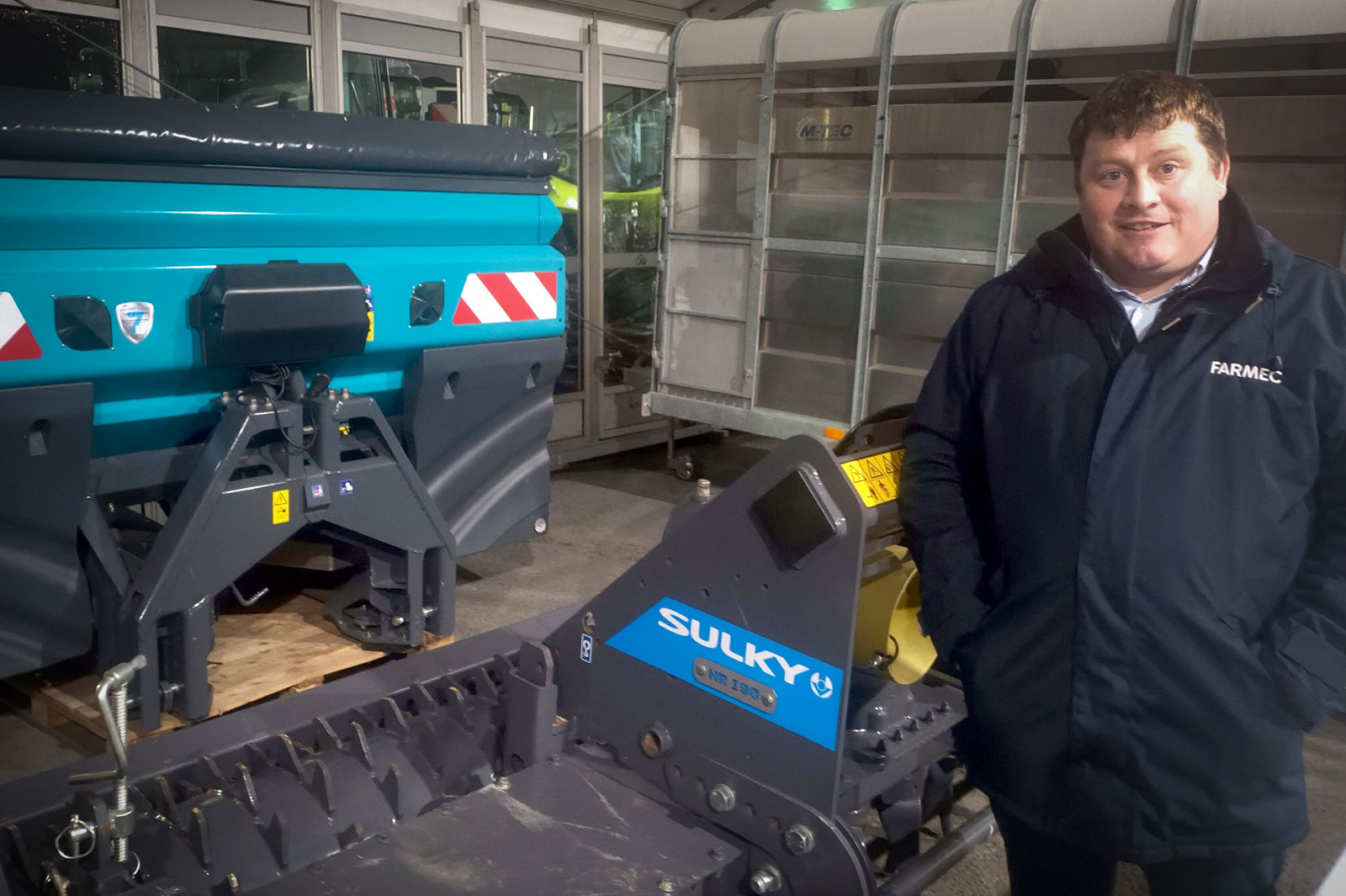Stephen Cooney, sales and service manager of Farmec Ireland with some of the Sulky machinery on display at the event.