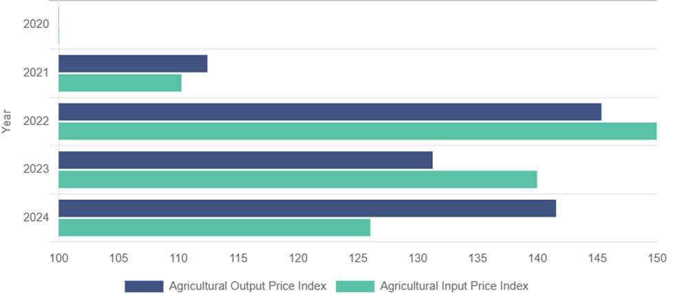 Annual agricultural input and output price indices (base 2020 = 100). Source: CSO.